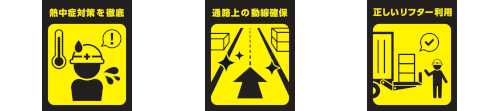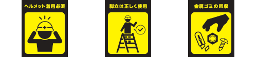 「ヘルメット着用」「脚立の正しい使い方」「金属ごみの回収」および「熱中症対策」「場内通路・導線確保」「荷物の積み降ろし」の注意喚起を目的としたピクトデザイン。